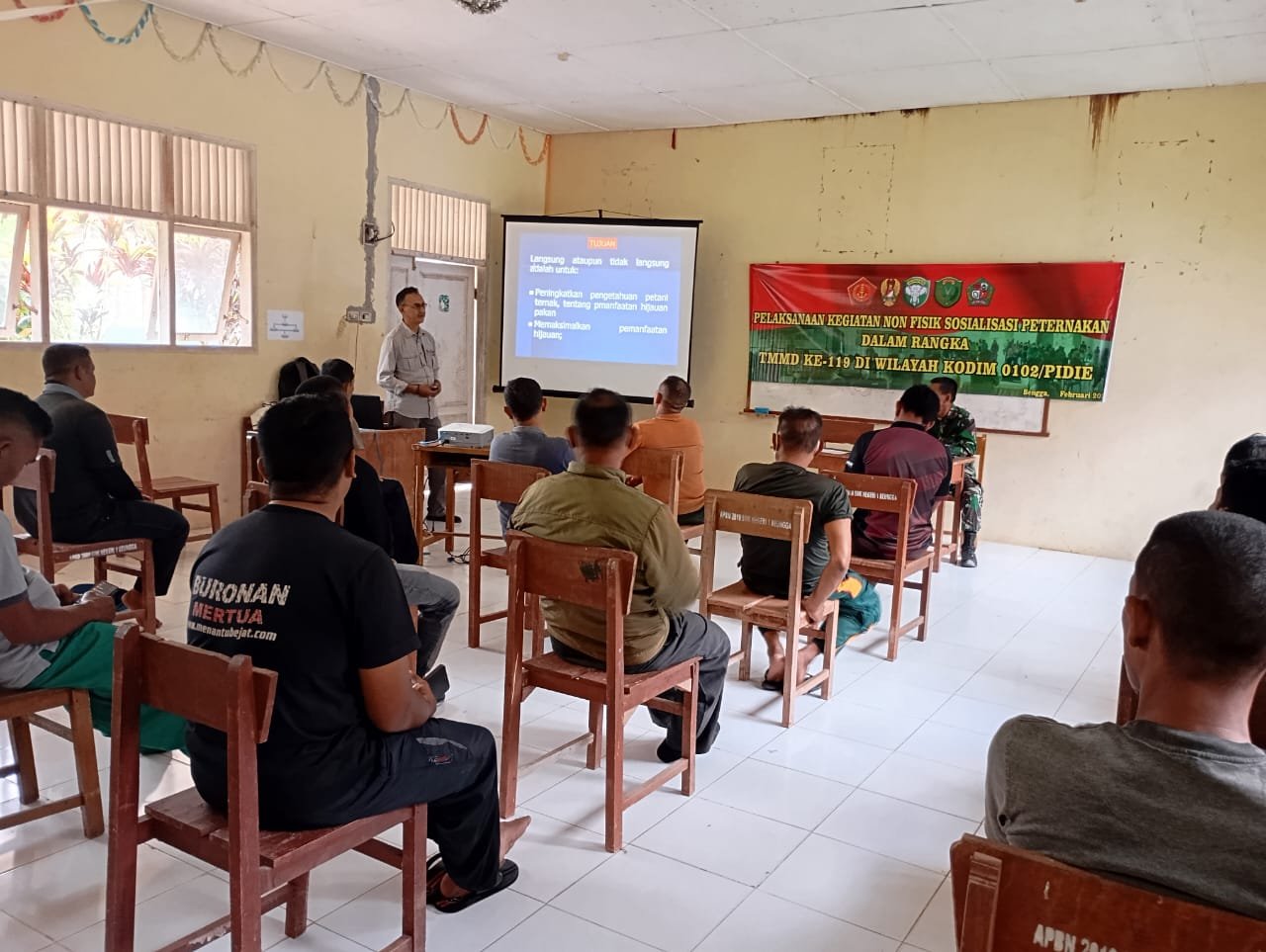 Dalam meningkatkan pemahaman dan keterampilan masyarakat di sektor pertanian/peternakan, sebagai sasaran Nonfisik Satgas TMMD Reguler Ke-119 Kodim 0102/Pidie yang bekerja sama dengan Dinas Pertanian/Peternakan Pidie mengadakan Sosialisasi Penyuluhan Pertanian dan Peternakan di Gampong Beungga, Kecamatan Tangse, Kabupaten Pidie, Sabtu (02/03/2024).