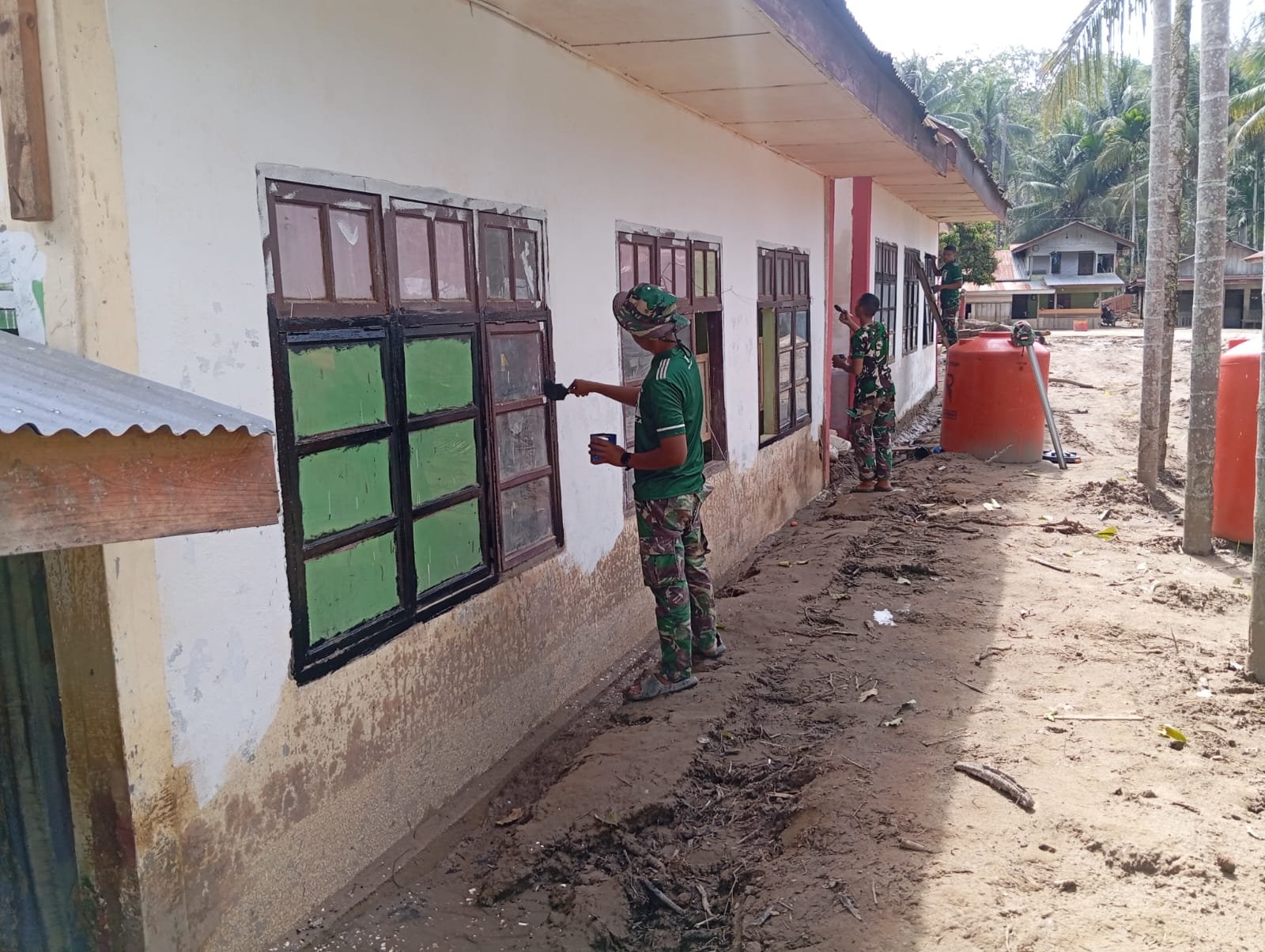 Di lapangan, personel Satgas bersama warga melakukan pengecatan dinding dengan warna dasar putih, pengecatan kusen pintu dan jendela menggunakan cat minyak warna hitam, serta kombinasi pengecatan tulang-tulang gedung dengan warna merah.
