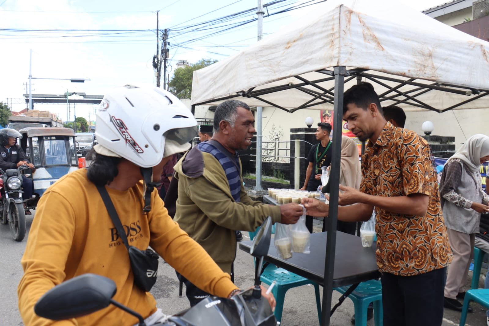 Dalam kegiatan tersebut, para peserta secara gotong royong memasak bubur susu kacang hijau, kemudian membagikannya kepada masyarakat yang melintas dan membutuhkan.