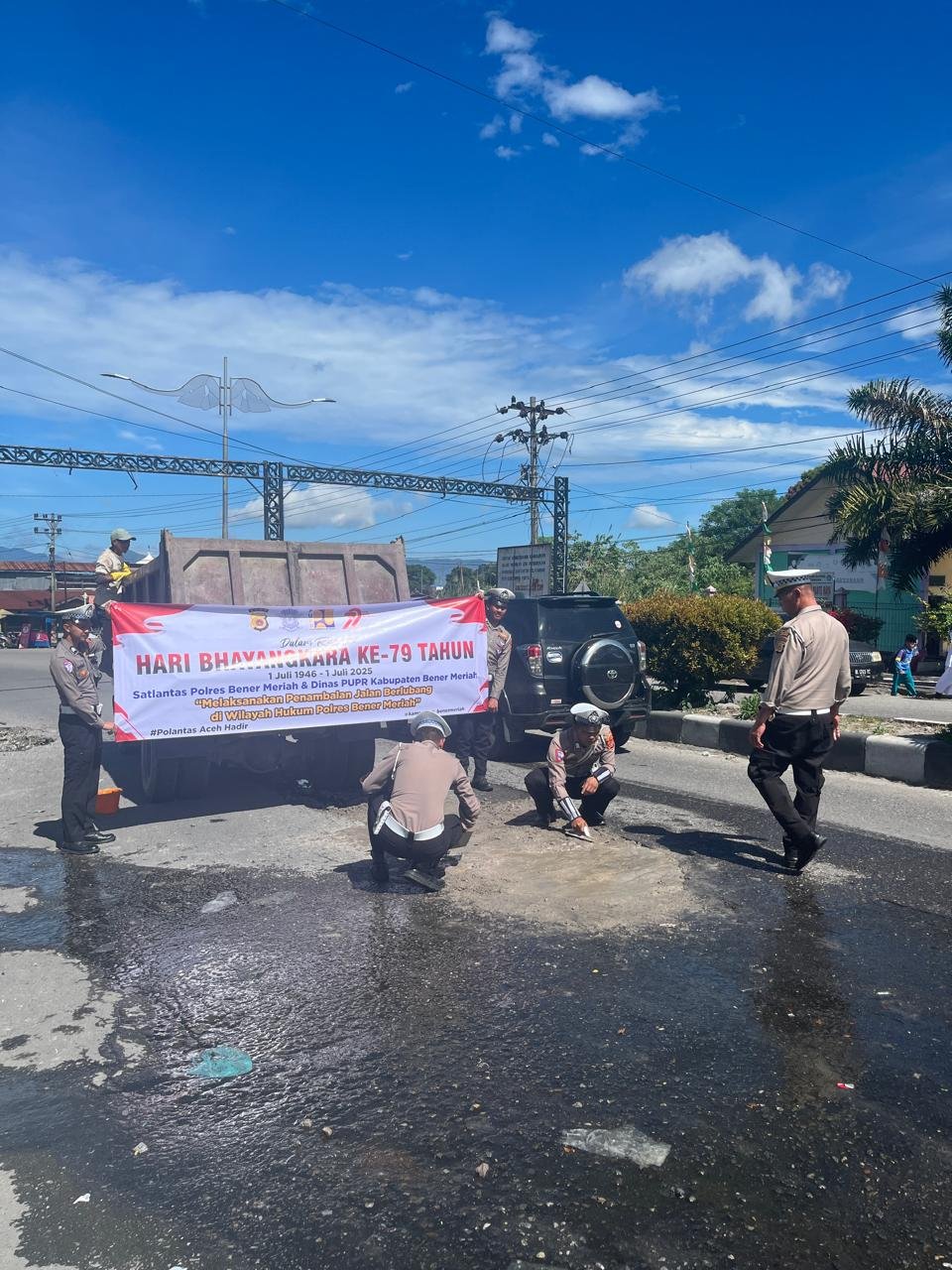 Bener Meriah, Satupena.co.id,- Dalam rangka menyambut Hari Lahir Bhayangkara ke-79, Satuan Lalu Lintas (Satlantas) Polres Bener Meriah bekerja sama dengan instansi terkait melaksanakan kegiatan penambalan jalan berlubang di sepanjang ruas Jalan Jalur Dua, tepatnya di kawasan Simpang Pante Raya hingga menuju Bandara Rembele, Kabupaten Bener Meriah. Rabu 11 Juni 2025.