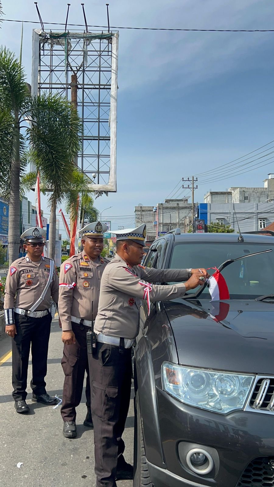 “dan bersama Ipda Sofyani Kbo Satlantas Polres Bireuen, dan 10 Personil Satlantas Polres Bireuen, Bagi – bagi bendera Merah Putih kepengendara,