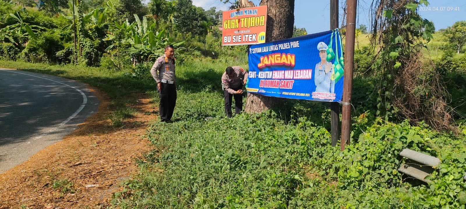 Satlantas Polres Pidie memasang spanduk imbauan kepada pengendara agar berhati-hati dalam membawa kendaraan. Spanduk itu bertuliskan “Jangan Kebut-Kebutan Emang Mau Lebaran Di Rumah Sakit”.
