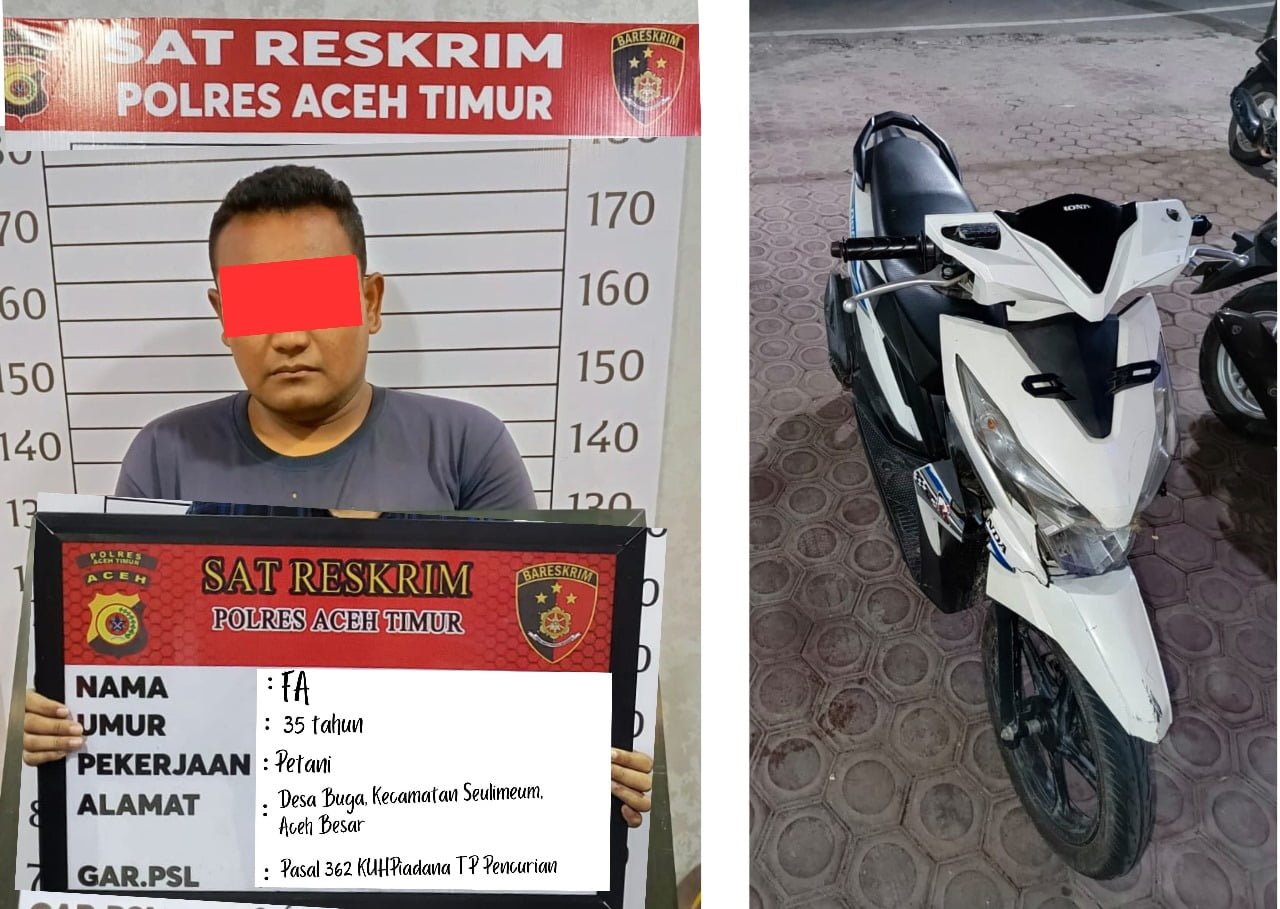 Hasil kerjasama anggota Opsnal Satreskrim Polres Aceh Timur dengan Polsek Kuala Simpang Polres Aceh Tamiang berhasil mengamankan pelaku (FA) berikut sepeda motor milik korban.