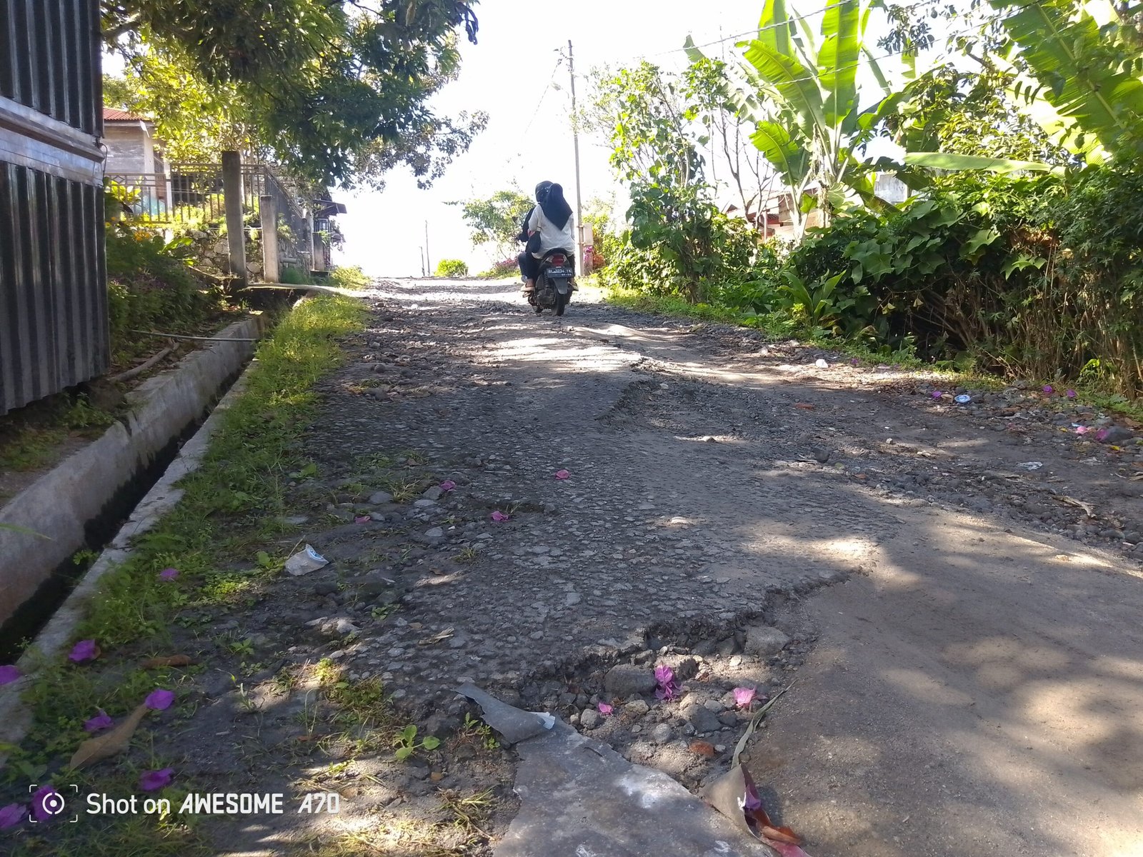 Namun, kerusakan jalan yang semakin parah, ditambah aliran parit limbah yang memotong jalur, membuat perjalanan menjadi semakin berat dan berbahaya.
