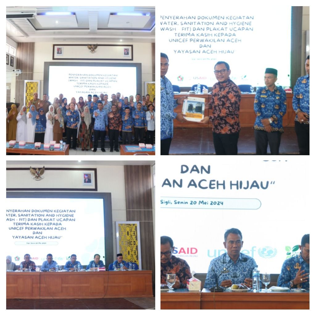 Sigli – Sekretaris Daerah Kabupaten Pidie, Drs. Samsul Azhar menghadiri dan memberikan sambutan pada Acara Penyerahan Dokumen Kegiatan Water and Sanitation for Health Facility Improvement Tools (WASH FIT) oleh Yayasan Aceh Hijau kepada Pemerintah Kabupaten Pidie dan Penyerahan Plakat Ucapan Terima Kasih kepada UNICEF dari Pemerintah Kabupaten Pidie. Di Oproom Kantor Bupati Pidie. Senin, 20/05/2024).