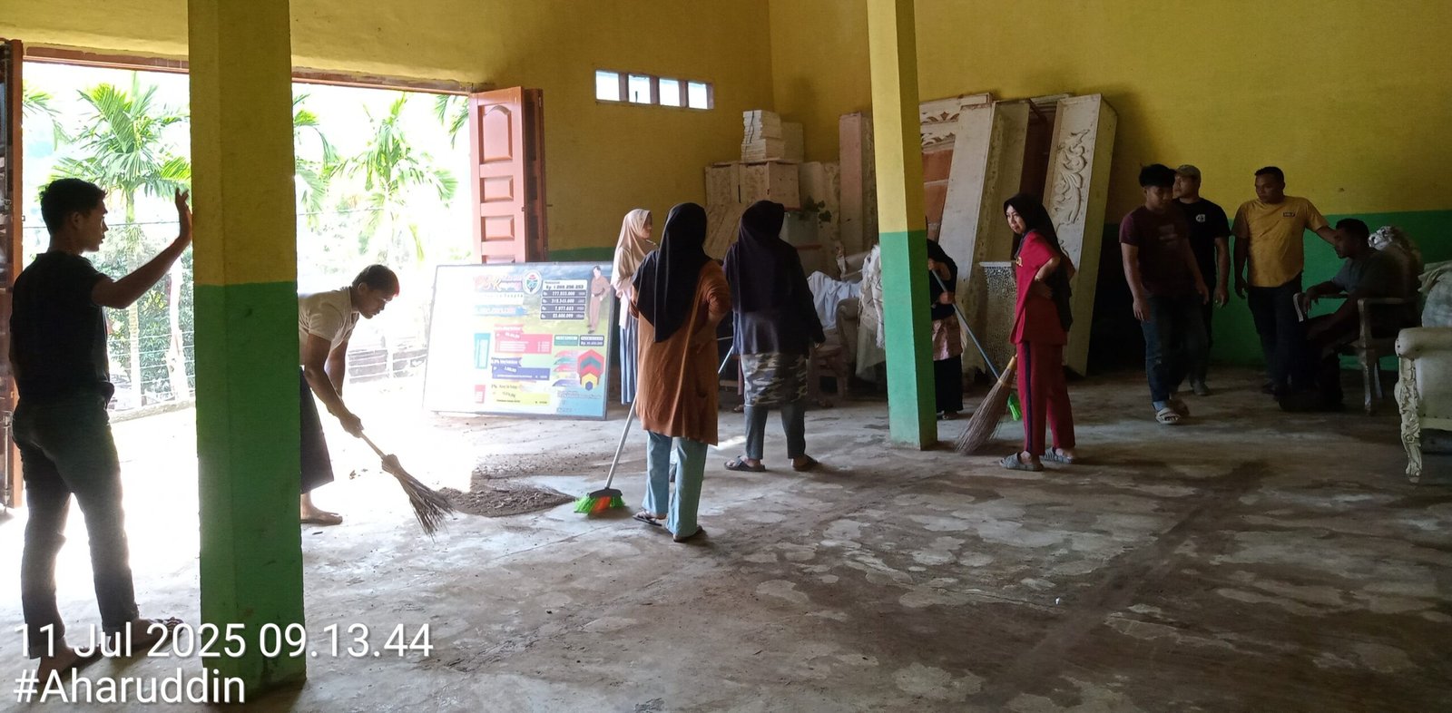 Dengan alat kebersihan sederhana seperti cangkul, sapu, parang, dan karung sampah, para aparatur kampung bahu-membahu membersihkan halaman, memotong rumput liar, dan merapikan tanaman di sekitar kantor desa. Suasana akrab dan penuh semangat terlihat jelas sepanjang kegiatan berlangsung.