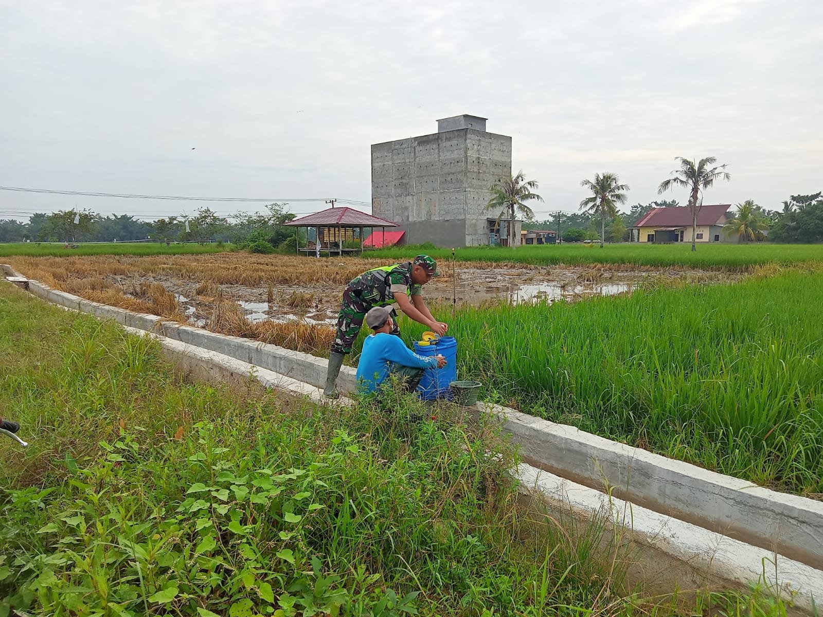 Dalam mengantisipasi Serangan Hama, Babinsa Koramil 03/Seruway Serda Budi dampingi petani dalam penyemprotan hama padi di sawah milik Pak Ponidi seluas 7 Rante, di Desa Muka sungai Kuruk, Kecamatan Seruway, kabupaten Aceh Tamiang. Kamis (13/02/2025)