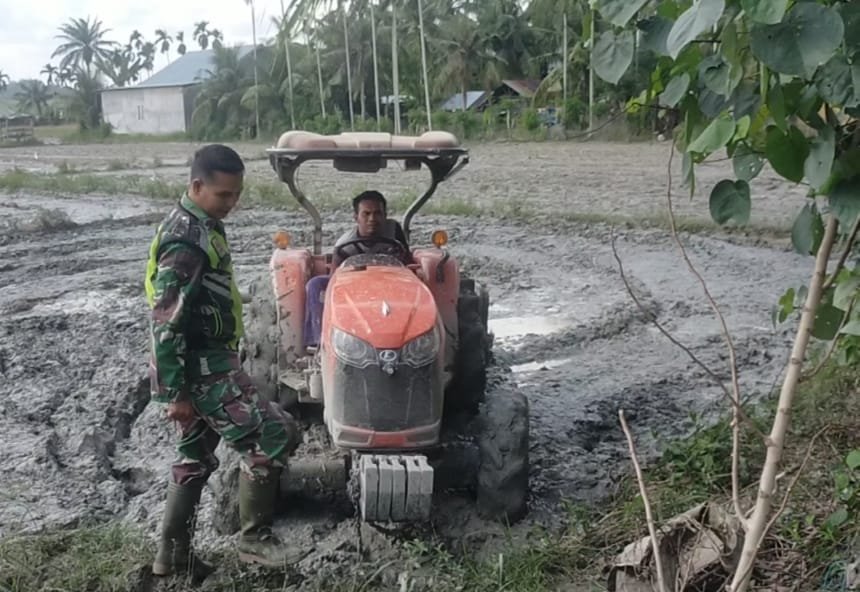 Babinsa Koramil 02/Karang Baru Serda Hendri S melaksanakan Kegiatan pendamping pengolahan tanah sawah untuk meningkatkan produktivitas pangan padi bertempat di Desa Paya Metah, Kecamatan Karang Baru, Kabupaten Aceh Tamiang. Senin (03/02/2025)