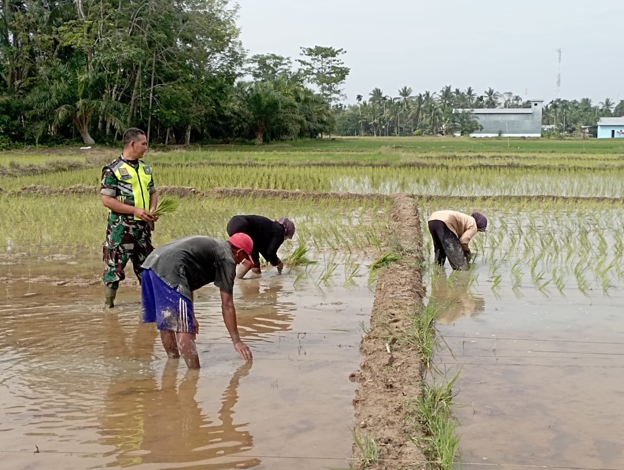 Babinsa Koramil 02/Karang Baru Serda Hendri Siregar turun langsung ke sawah membantu petani desa binaan menanam padi bertempat di Desa Paya Metah, Kecamatan Karang Baru, Kabupate Aceh Tamiang. Senin (10/02/2025)
