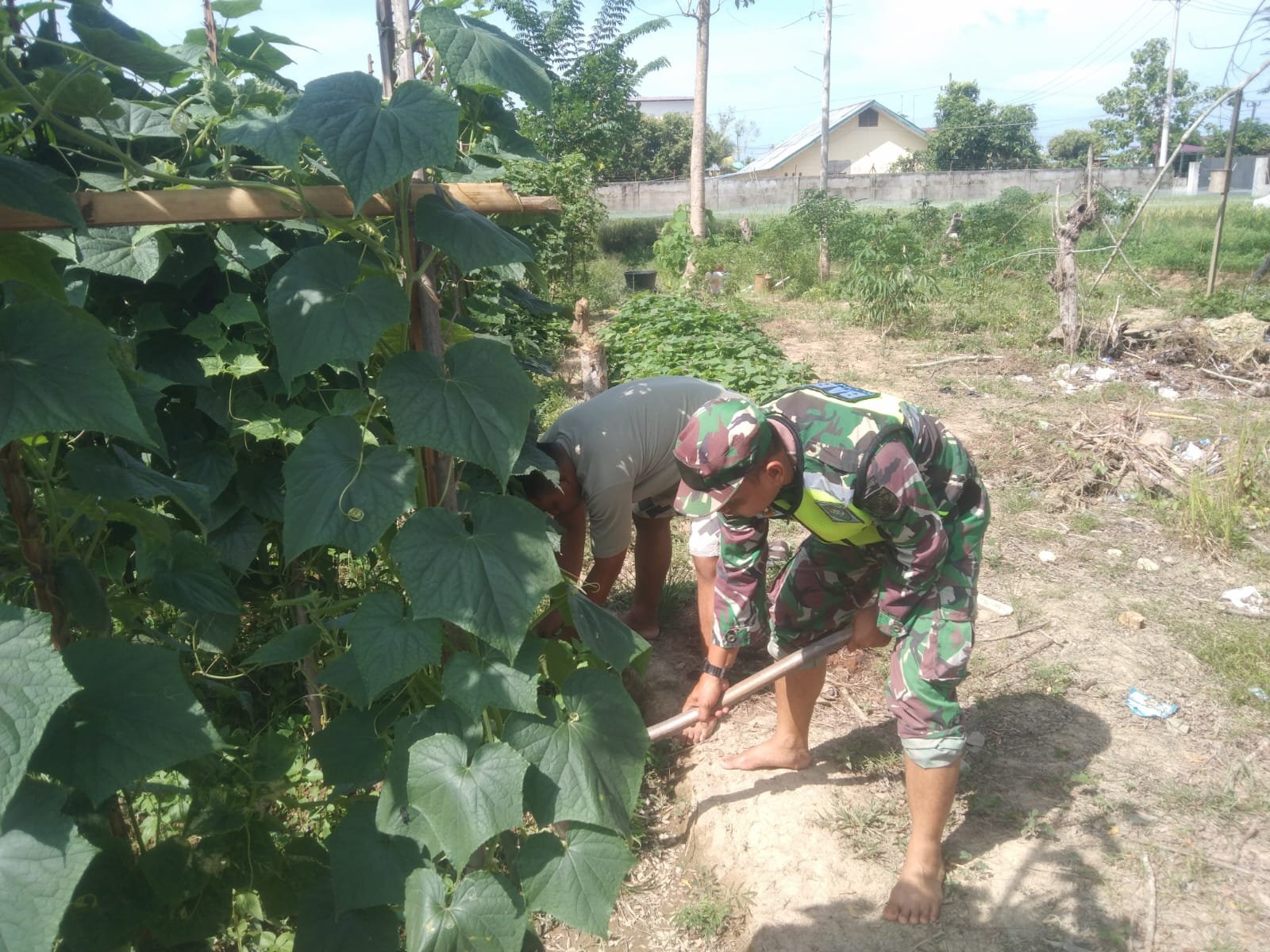 Babinsa Koramil 07/Kejuruan Muda Serda Wawan Kurniawan membantu petani membersihkan gulma yang menghambat pertumbuhan tanaman timun bertempat di Desa Tanjung Mancang, Kecamatan Kejuruan muda, Kabupaten Aceh Tamiang. Minggu (26/05/2024)