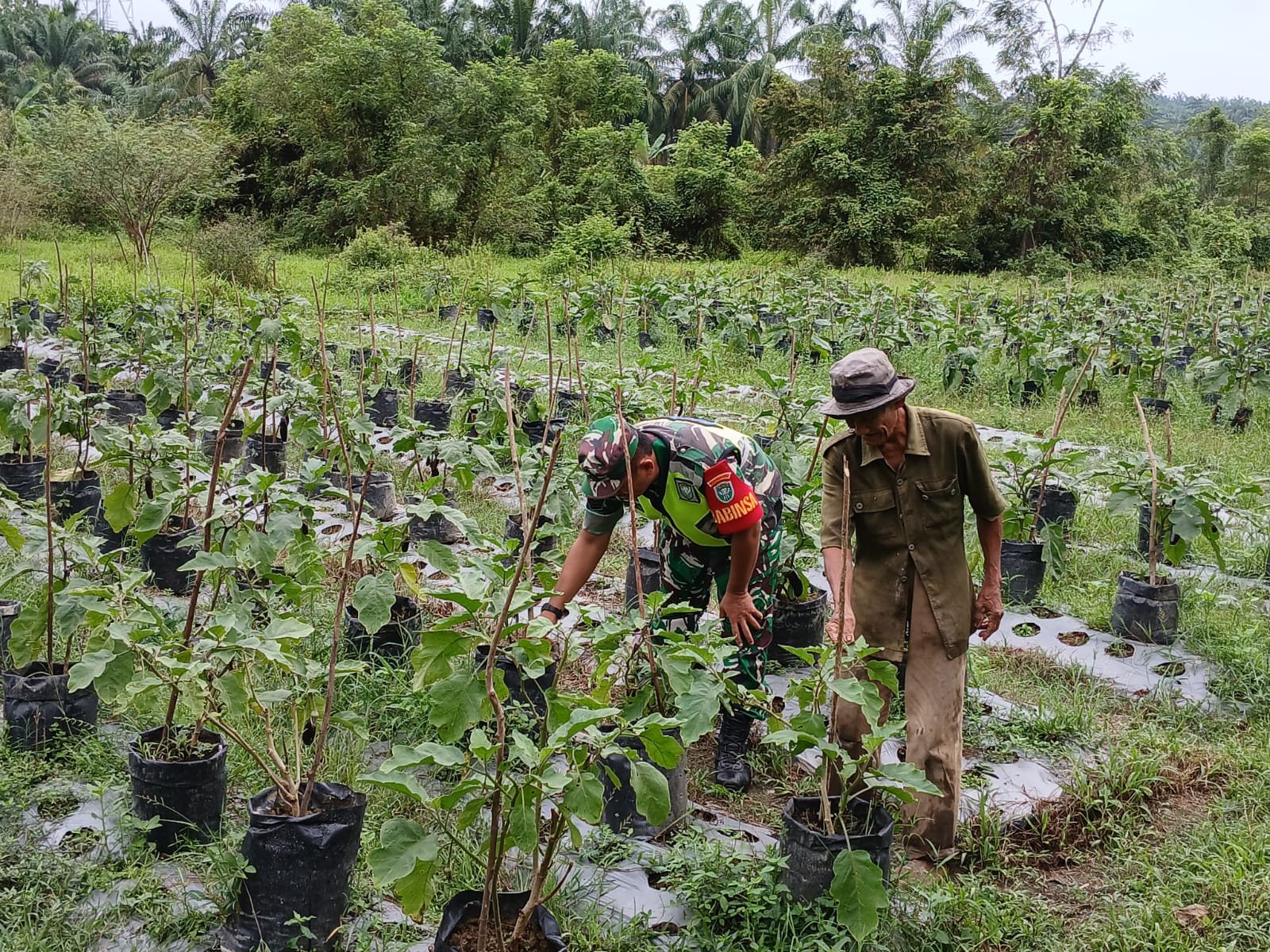 Serka Subagio Babinsa Koramil 08/Rantau melaksanakan komsos dengan bapak Basir serambi membantu merawat taman terong miliknya di Desa Durian, Kecamatan Rantau, Kabupaten Aceh Tamiang. Minggu (09/03/2025)