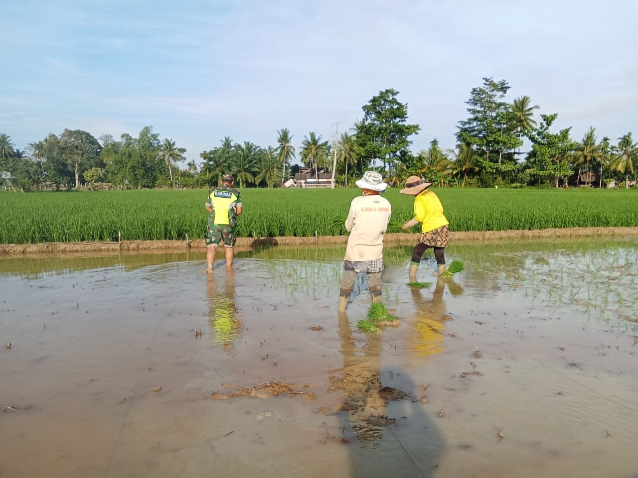 Babinsa Koramil 09/Banda Mulia jajaran Kodim 0117/Aceh Tamiang Serma Jhon Bm mendampingi Petani menanam Padi milik bapak Julkipli di Desa Matang Seping, Kecamatan Banda Mulia, Kabupaten Aceh Tamiang, pada Senin (20/01/2025)