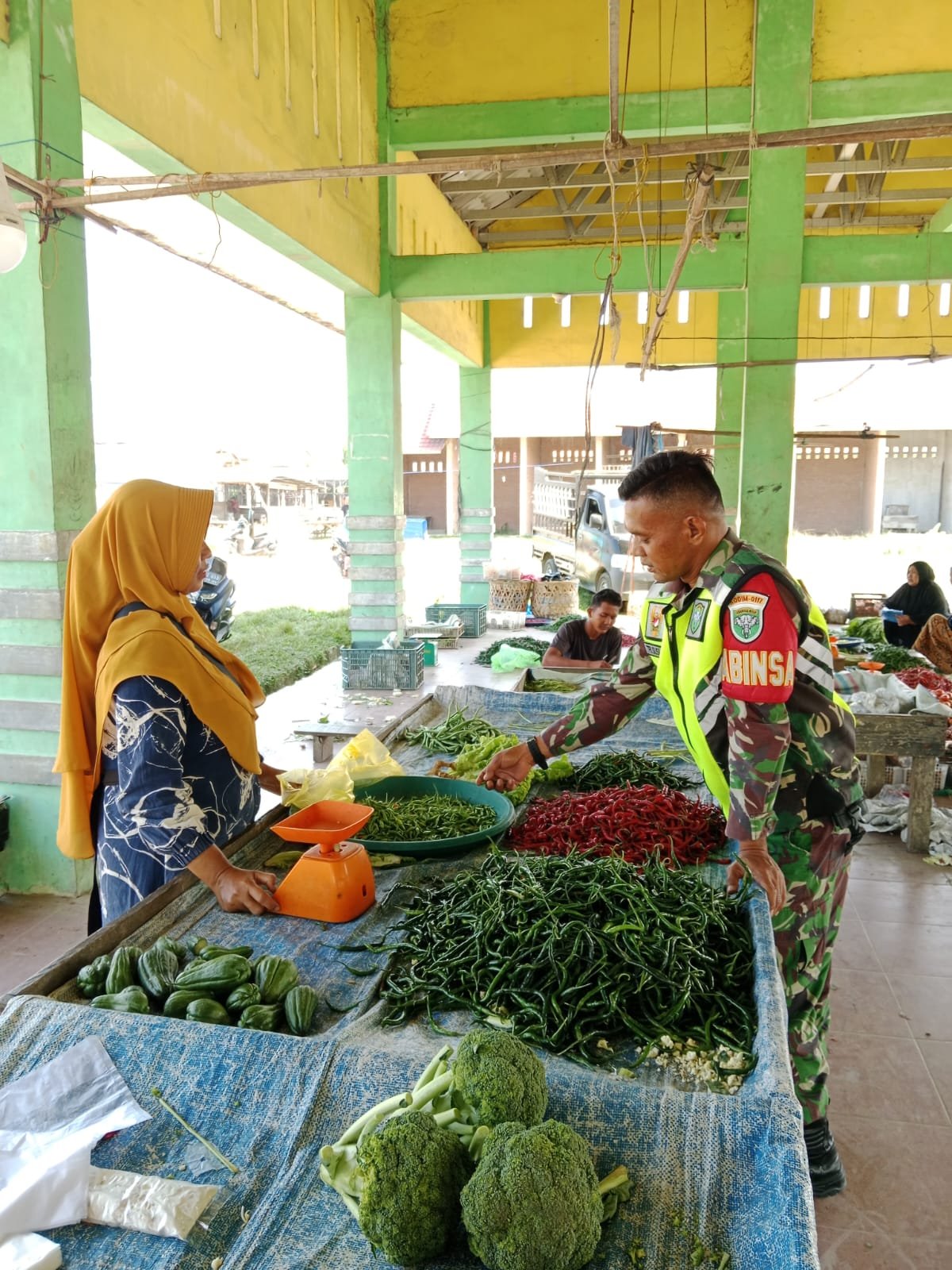 Untuk memantau perkembangan situasi wilayah serta harga bahan pokok, Babinsa Koramil 06/Manyak Payed Sertu Tri Susilo, melaksanakan komunikasi sosial (Komsos) dengan pedagang sayur di Desa Tualang Baro, Kecamatan Manyak Payed, Kabupaten Aceh Tamiang. Rabu (05/03/2025)