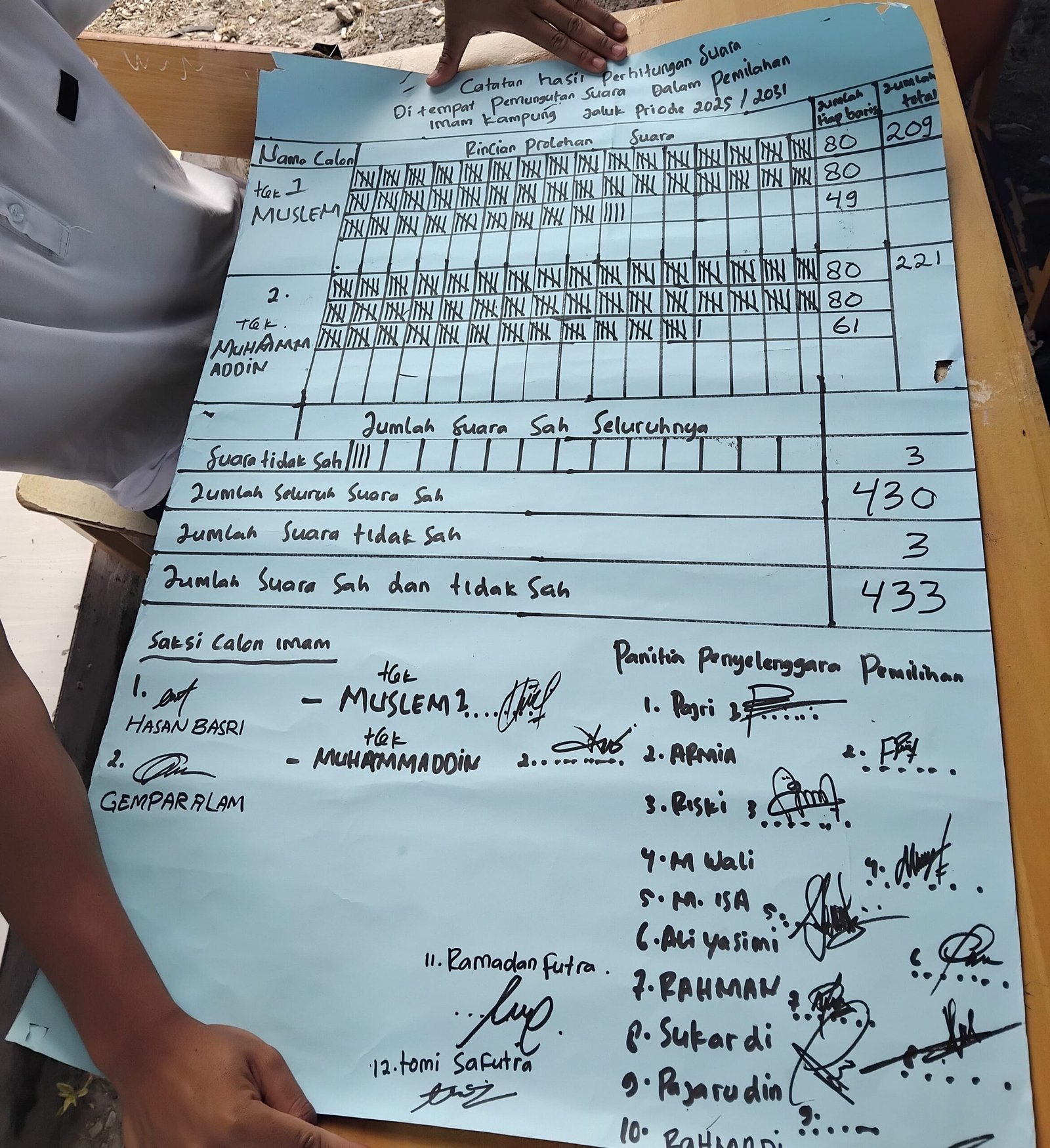 Dengan selisih tipis, Tgk. Muhammadin kembali dipercaya oleh masyarakat Kampung Jaluk untuk memimpin sebagai Imem kampung.