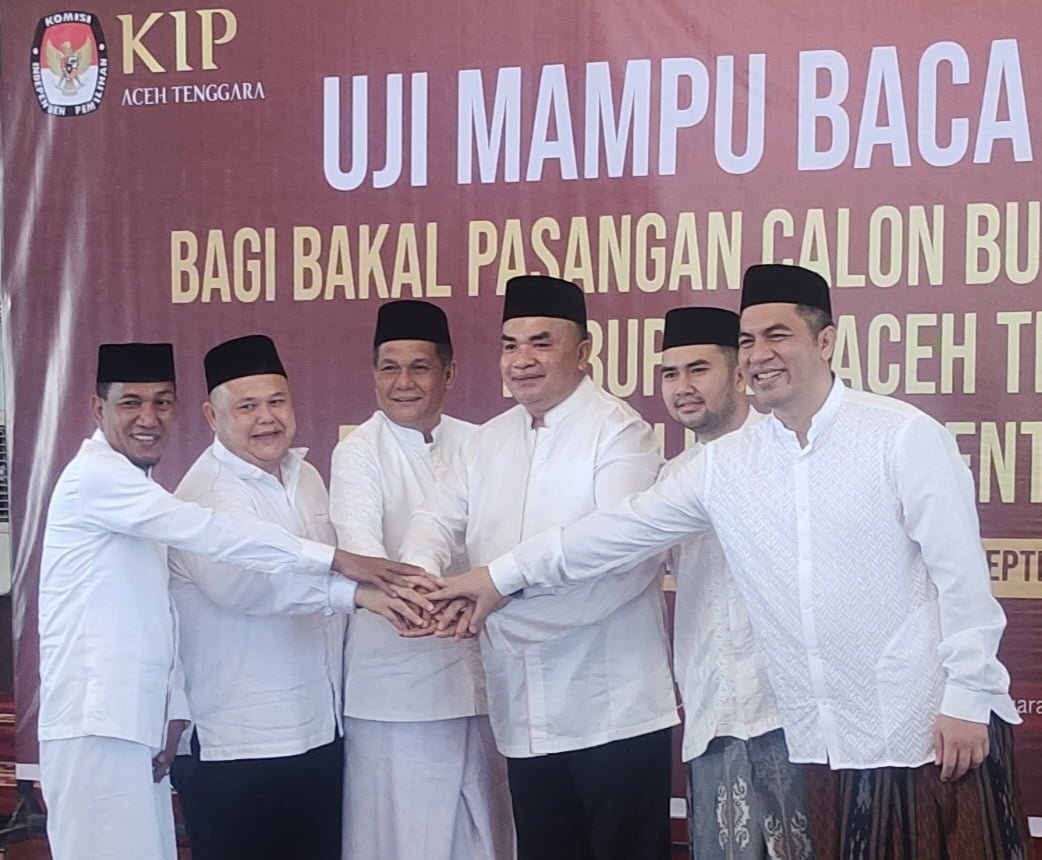 Tiga Pasangan Calon (Paslon) Bupati dan Wakil Bupati Kabupaten Aceh Tenggara (Agara) mengikuti tes uji mampu baca Al Quran yang dilaksanakan Komisi Independen Pemilihan (KIP) di Masjid Agung At -Taqwa, Kamis 5 September 2024.