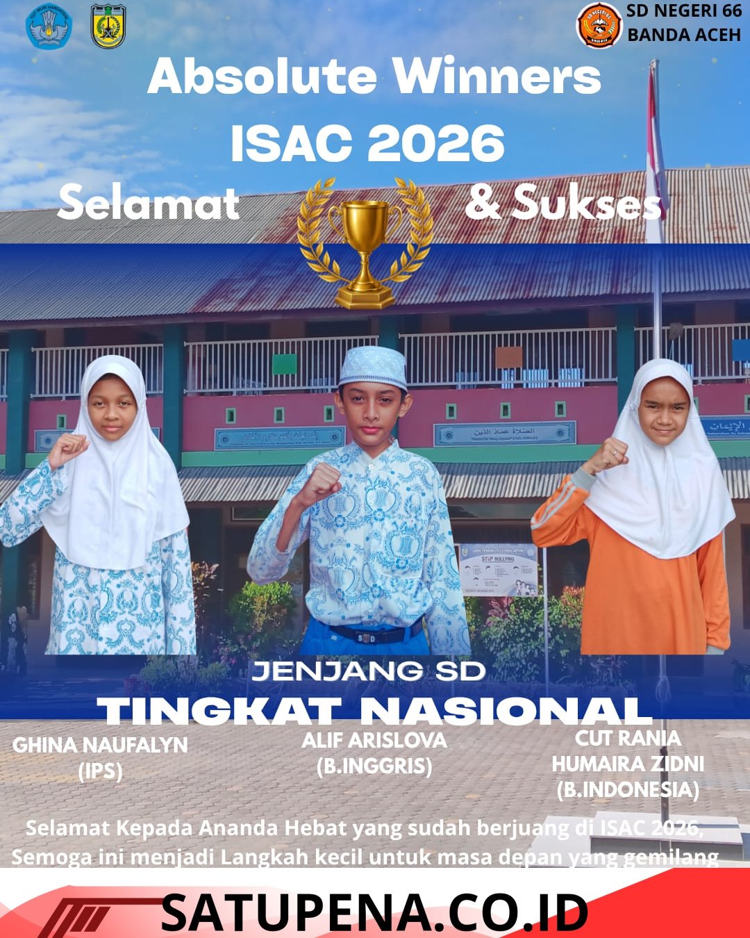 Banda Aceh- Satupena.co.id: Kabar membanggakan datang dari SD Negeri 66 Banda Aceh. Tiga siswanya berhasil meraih predikat Absolute Winners dalam ajang International Student Achievement Competition (ISAC) 2026.