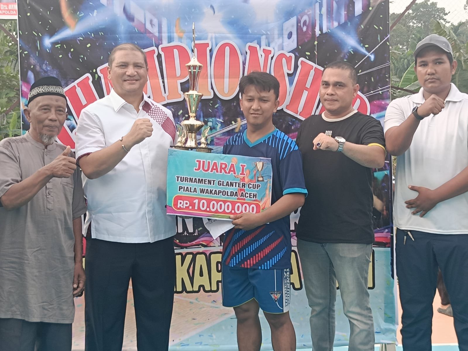 Pantau awak media di lokasi Wakapolda Aceh Brigjen. Pol. Armia Fahmi didamping Kapolres Aceh Tamiang AKBP Muliadi. SH.M.H, menyerahkan hadiah kepada tim yang meraih juara turnamen bola voly piala Wakapolda Aceh Cup I. (Eri Beo).