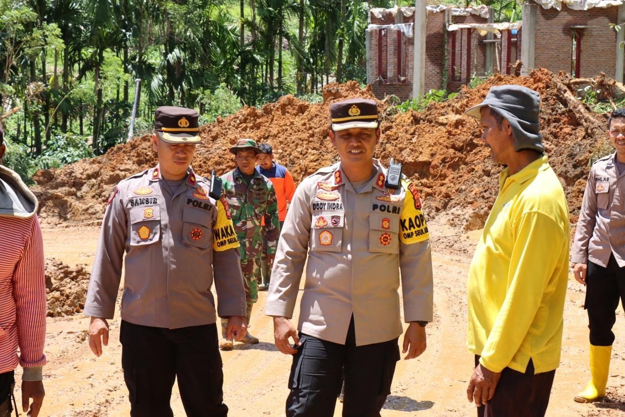 Kapolres Aceh Tengah AKBP Dody Indra Eka Putra,S.I.K, M.H, bersama Wakapolres dan Pju meninjau Lokasi bencana tanah longsor dan banjir bandang di Kampung Sepakat dan Ramung Ara Kecamatan Celala Kabupaten Aceh Tengah, sekaligus memberikan bantuan kemanusiaan, Pada Rabu 9 Oktober 2024.