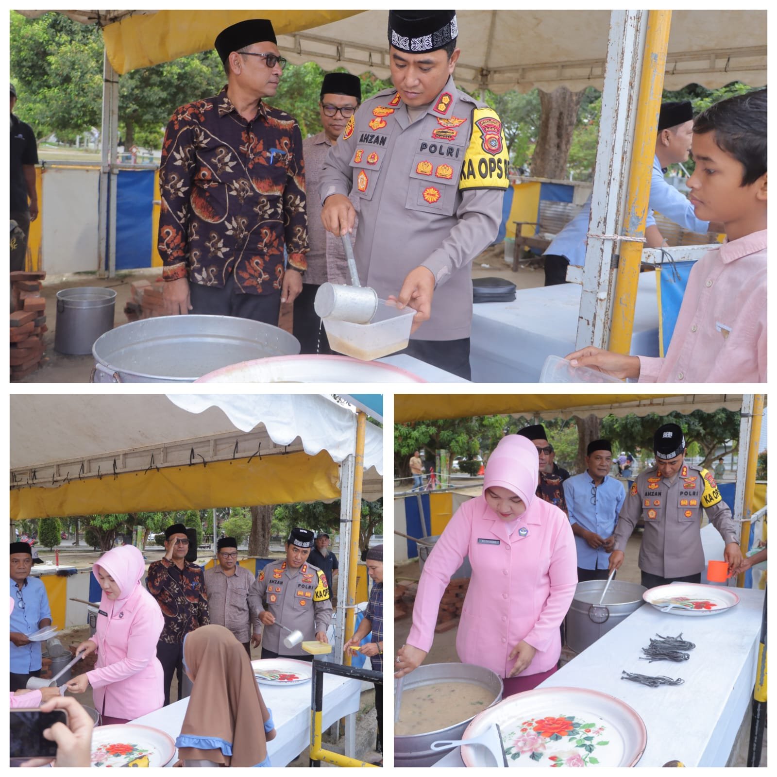 Lhokseumawe-Satupena.co.id: Tradisi berbagi bubur kanji di bulan suci Ramadan kembali terasa hangat di Kota Lhokseumawe. Kapolres Lhokseumawe, AKBP Dr. Ahzan, S.H., S.I.K., M.S.M., M.H., bersama Ketua Bhayangkari Cabang Lhokseumawe, Ny. Ita Ahzan, turun langsung melayani masyarakat dengan membagikan bubur kanji dan takjil berbuka puasa di halaman Masjid Islamic Center Lhokseumawe, Senin (16/3/2026) sore.