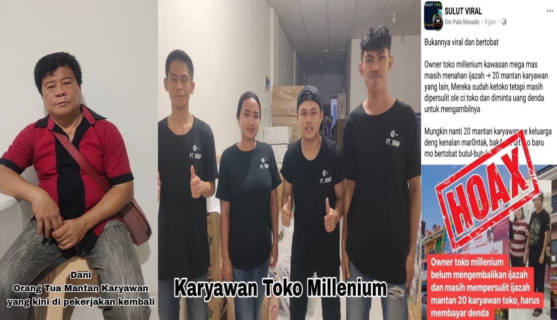 “Bukannya viral dan bertobat, Owner toko millenium kawasan mega mas masih menahan ijazah -+ 20 mantan karyawan yang lain, Mereka sudah ketoko tetapi masih dipersulit ole ci toko dan diminta uang denda untuk mengambilnya. Mungkin nanti 20 mantan karyawan pe keluarga deng kenalan mar0ntak, bak4cau ditoko baru mo bertobat butul-butul,” Tulis Akun anonim bernama Om Pala Manado dengan narasi bohong.