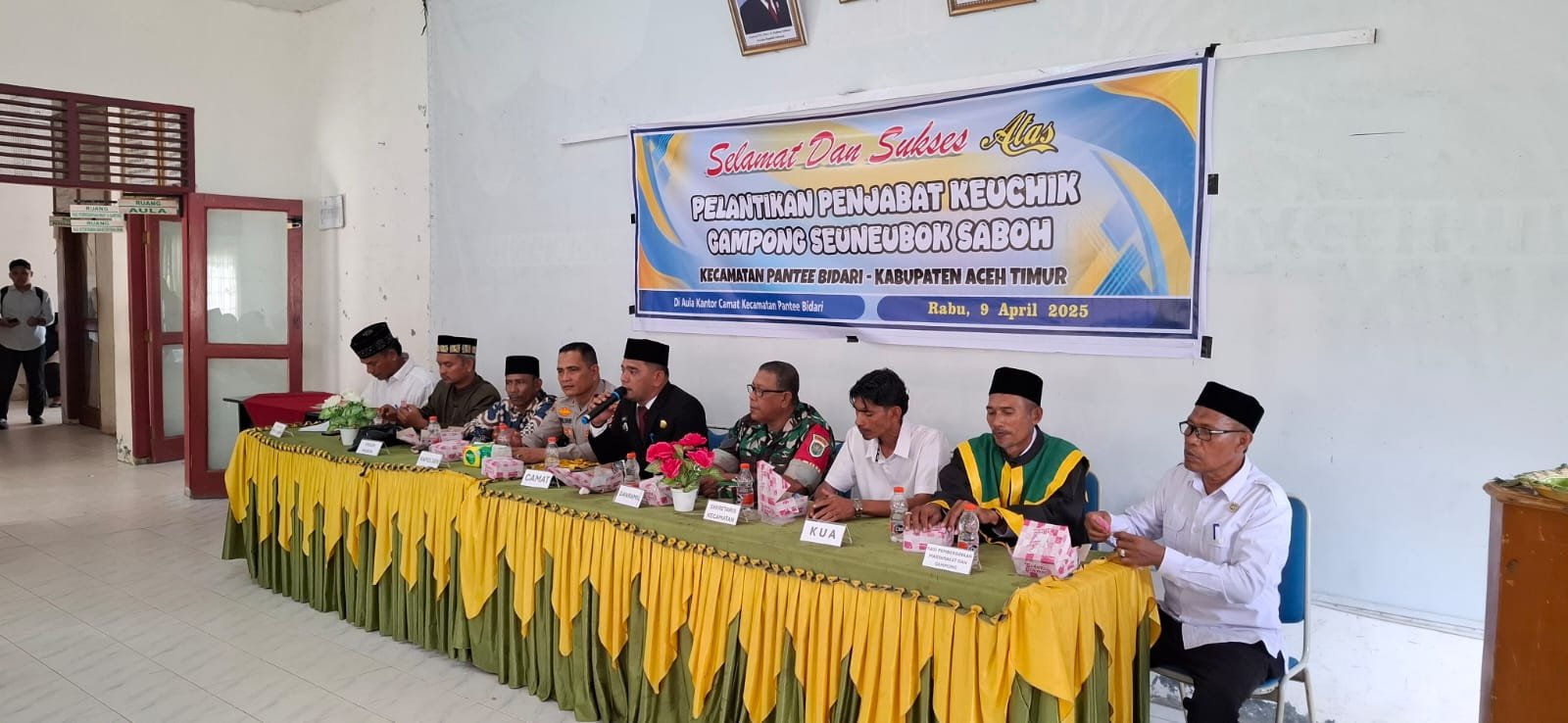 Pelantikan tersebut dipimpin langsung oleh Camat Pantee Bidari, Darkasyi, SE, dan turut dihadiri oleh jajaran Muspika, para tokoh masyarakat, serta perwakilan dari berbagai instansi, termasuk Kapolsek Pantee Bidari Ipda Saiful Bahri.SE, Danramil, KUA, Imum Mukim Blang Seunong, M.Nasir mantan Keuchik Seunubok Saboh, serta sejumlah Keuchik lainnya.
