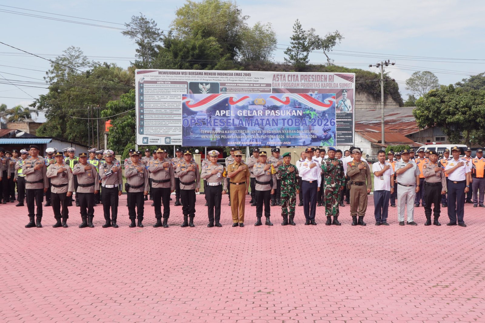 Apel gelar pasukan dipimpin oleh Wakapolres Toba, Kompol Marluddin, S.Ag., M.H., bersama Wakil Bupati Toba, Audi Murphy O. Sitorus, dan diikuti oleh personel gabungan dari Polri, TNI, Dinas Perhubungan, BPBD, serta Dinas Kesehatan.