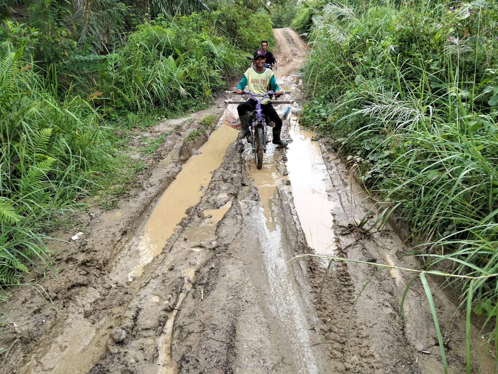 Jalan yang menjadi akses keluar-masuk serta jalur utama mengangkut hasil pertanian warga tersebut kini dipenuhi lubang dan parit di sepanjang badan jalan. Kondisi semakin parah ketika musim hujan, jalan berubah menjadi kubangan lumpur sehingga sulit dilalui, baik kendaraan roda empat maupun roda dua.