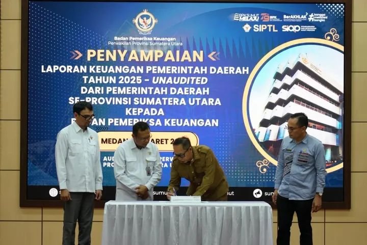 Pemerintah Kabupaten Tapanuli Utara secara resmi menyerahkan Laporan Keuangan Pemerintah Daerah (LKPD) Unaudited Tahun Anggaran 2025 kepada Badan Pemeriksa Keuangan (BPK) RI Perwakilan Provinsi Sumatera Utara di Auditorium Gedung BPK RI, Medan, Senin (30/3).