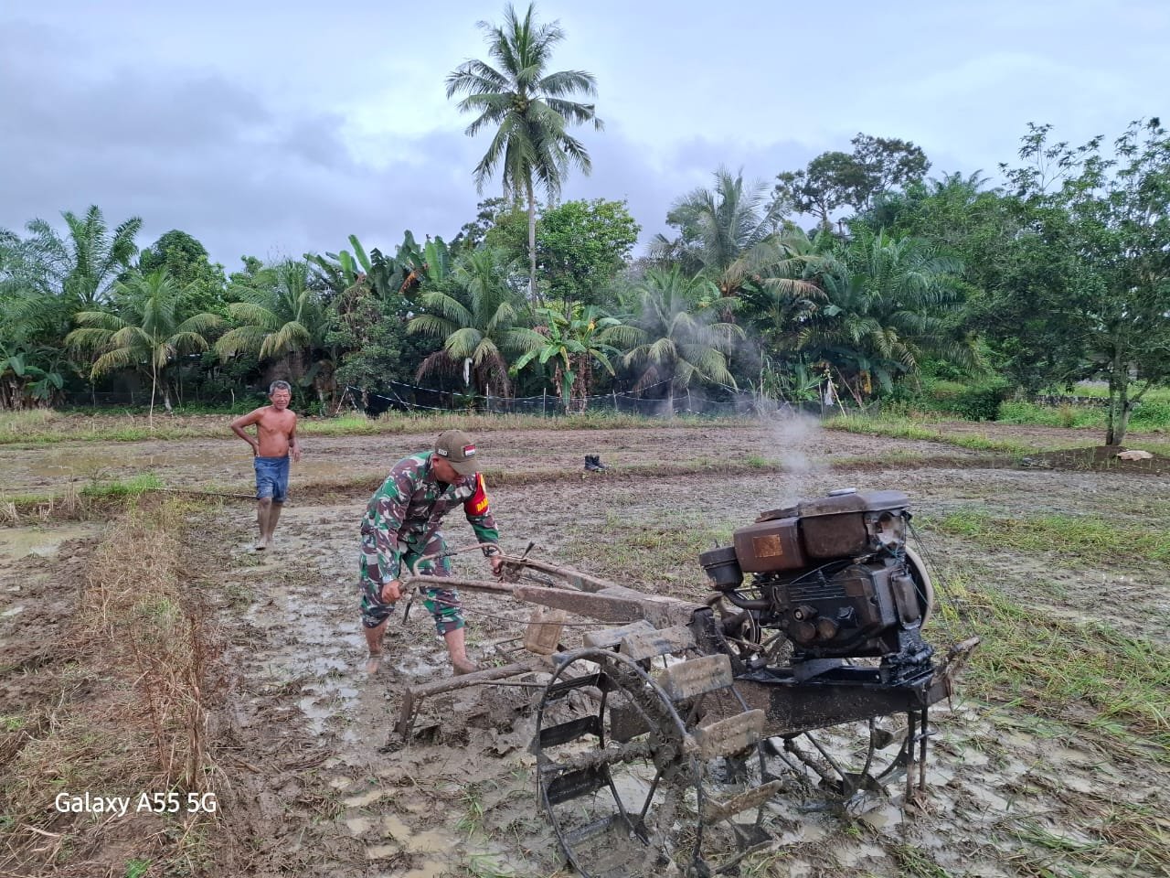 Dalam Rangka mendukung program ketahanan pangan di wilayah, Babinsa Koramil 06/Manyak Payed, Kodim 0117/Aceh Tamiang Serda Zulham melaksanakan pendampingan dan ikut turun ke sawah untuk membantu Petani membajak sawah milik Bapak Fani di Desa Seunebok Baru, Kecamatan Manyak Payed, Kabupaten Aceh Tamiang. Selasa (29/04/2025)